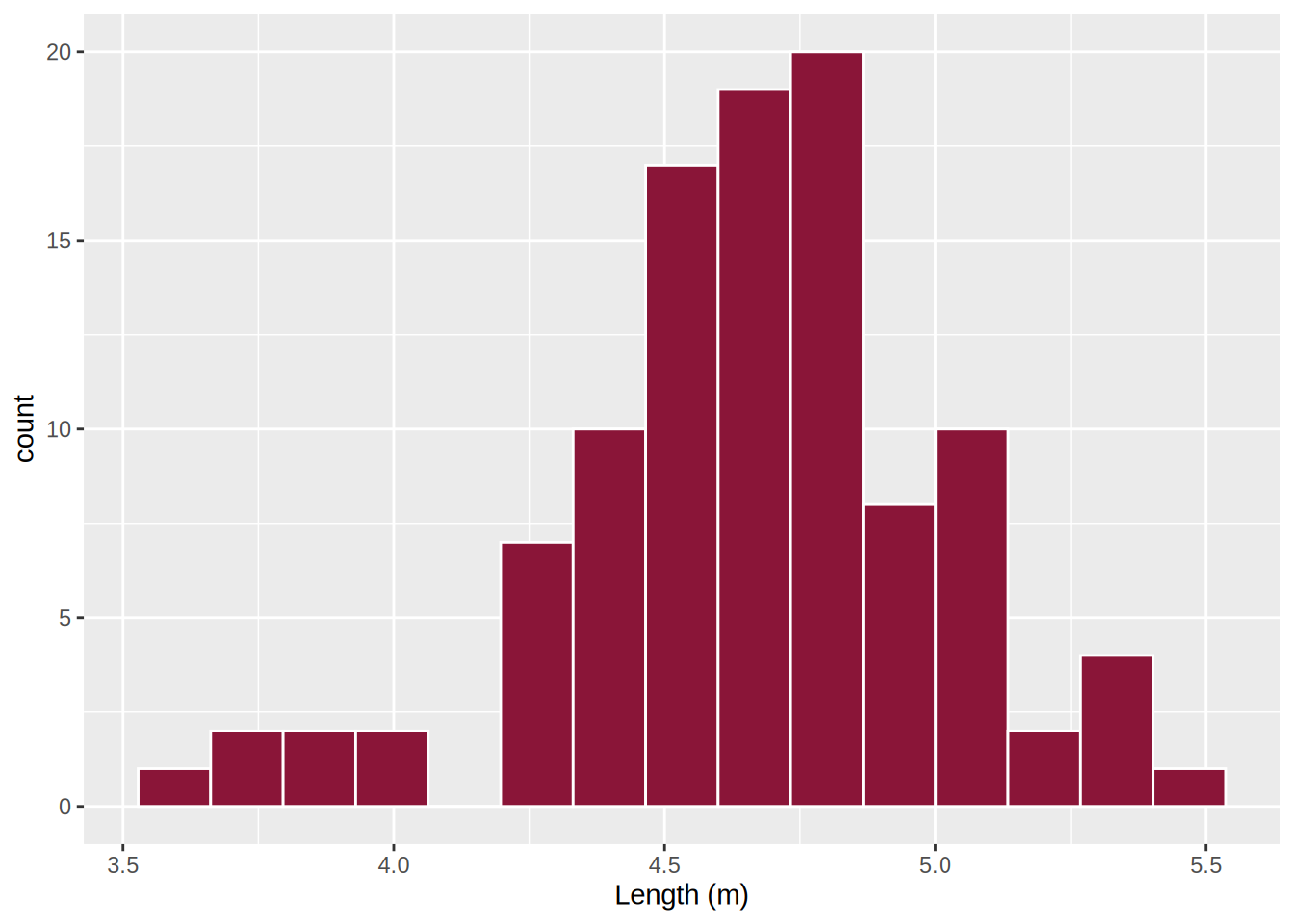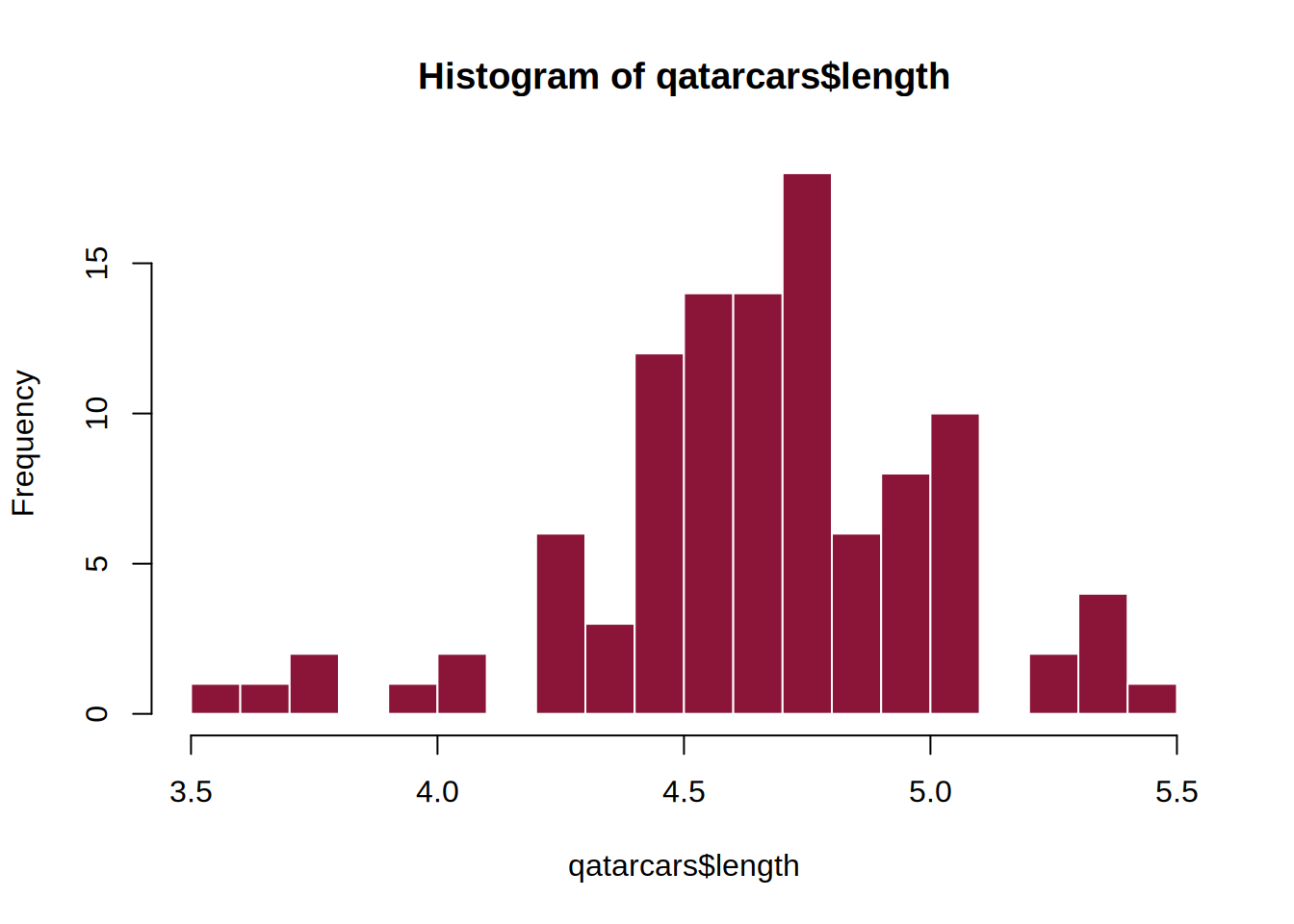 hist(qatarcars$length, breaks = 15, col = qatar_maroon, border = "white")