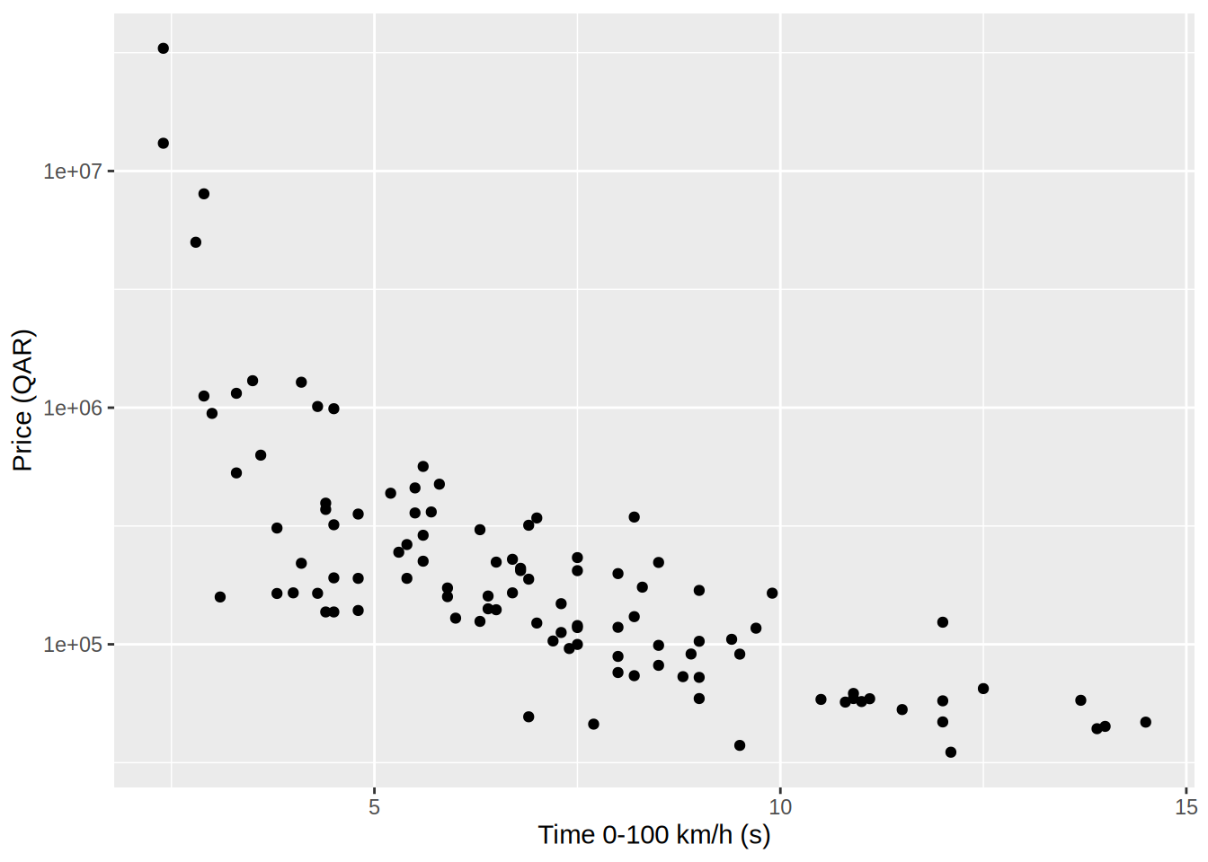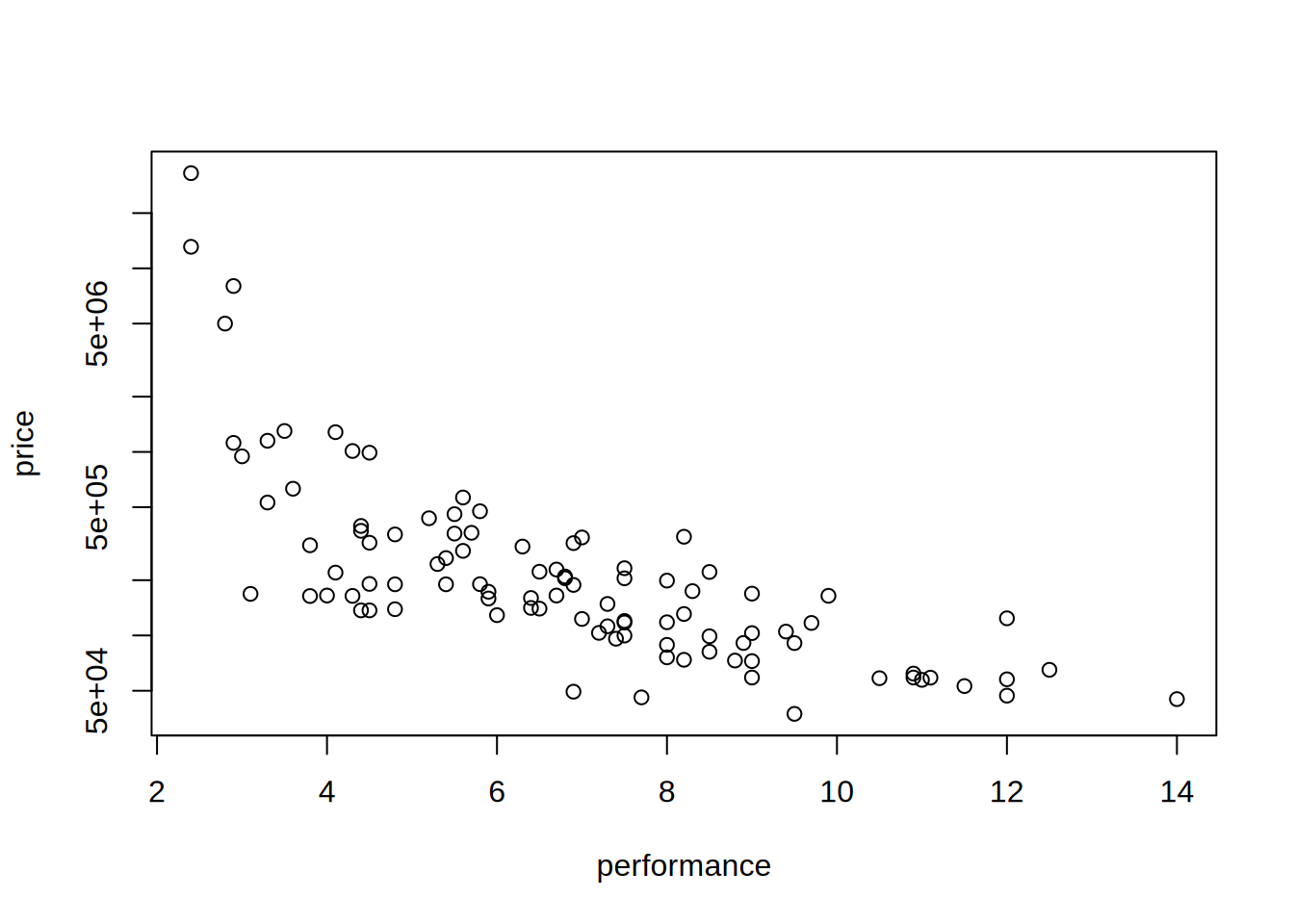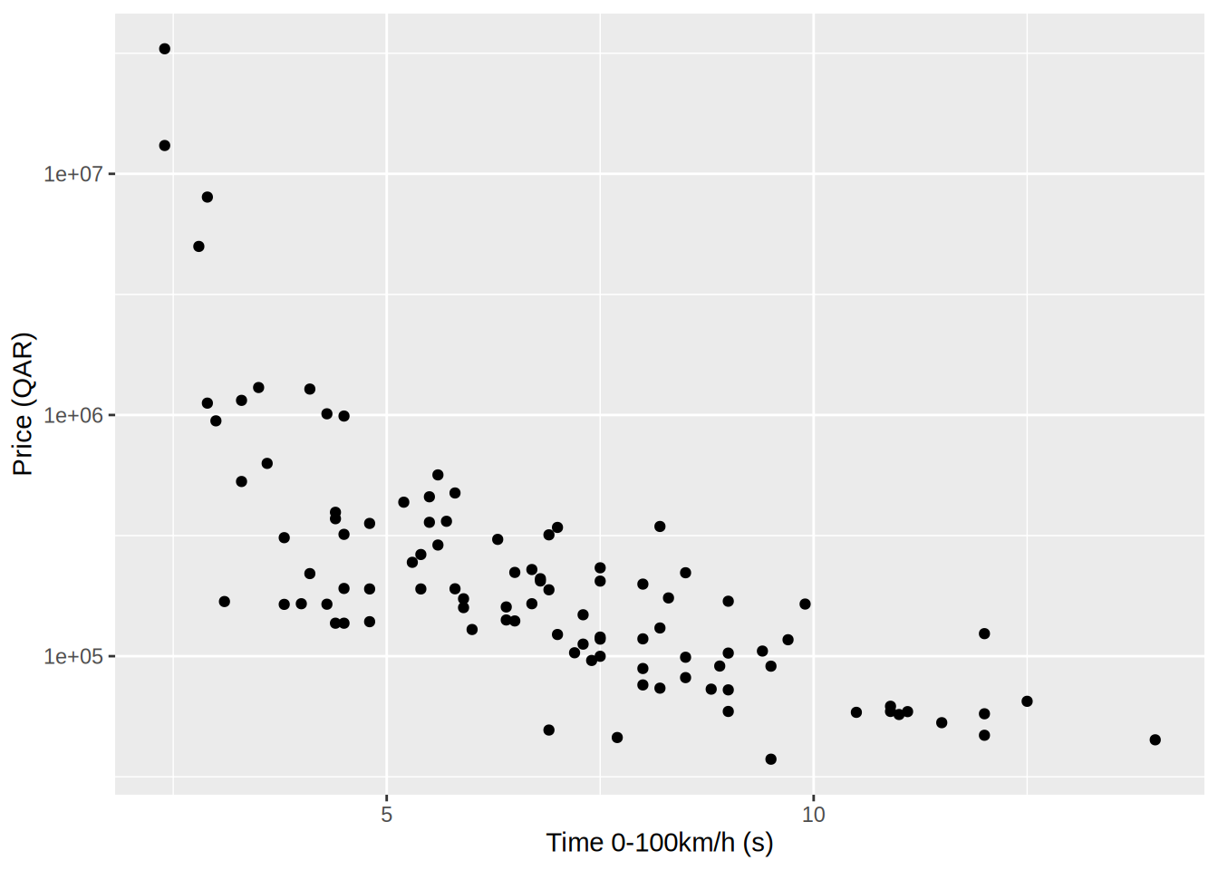 ggplot(qatarcars, aes(x = performance, y = price)) +